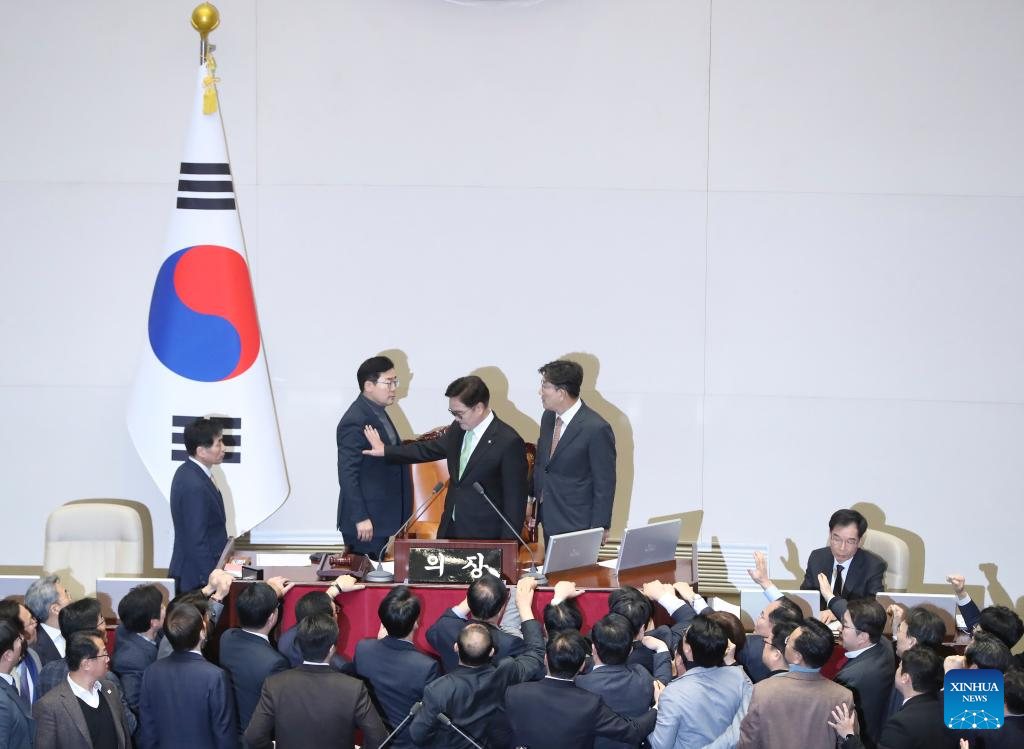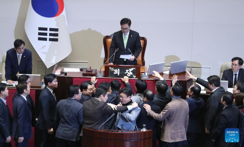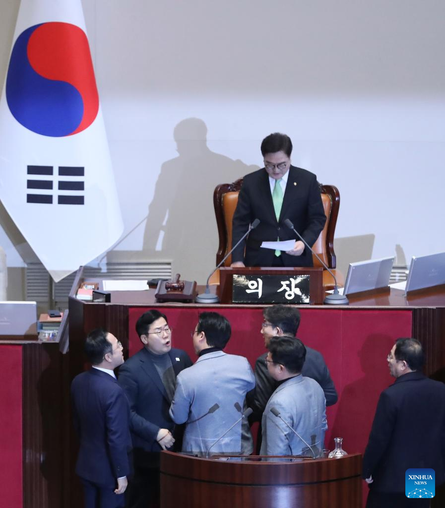 Lawmakers of the ruling People Power Party and the opposition party standing by the National Assembly Speaker Woo Won-shik (C, up) confront each other in Seoul, South Korea, Dec. 27, 2024. South Korea's opposition-controlled parliament voted Friday to impeach Prime Minister Han Duck-soo who had served as the acting president following President Yoon Suk-yeol's impeachment.