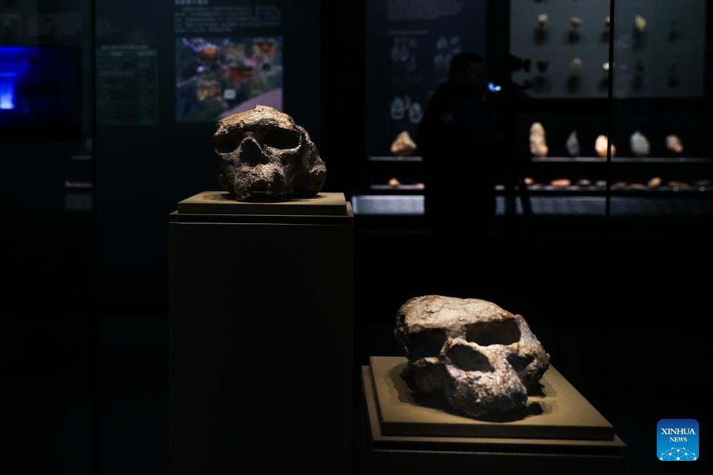 This photo taken on Dec. 26, 2024 shows a pair of fossil human skulls dating back to one million years ago at the Hubei Provincial Museum in Wuhan, central China's Hubei Province. The restored statues were unveiled by the Hubei Provincial Museum in central China on Thursday.