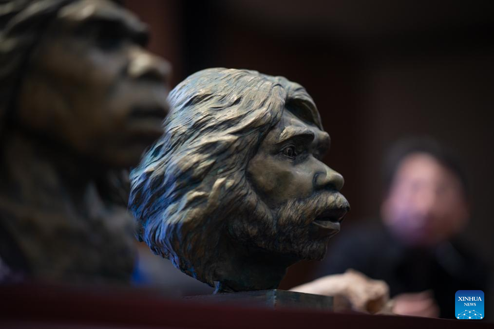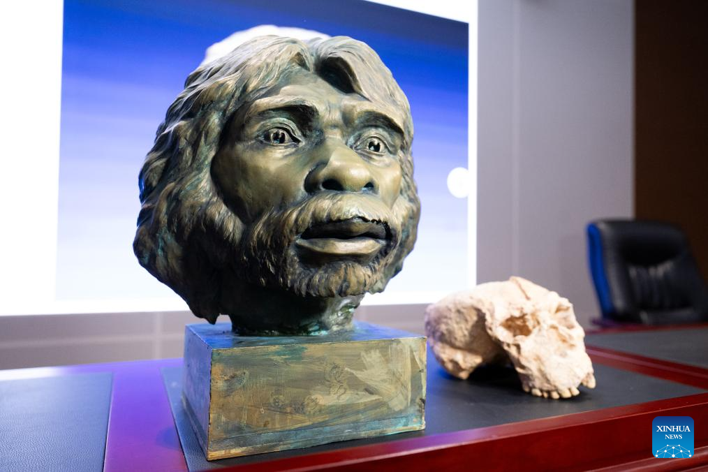 This photo taken on Dec. 26, 2024 shows the restored statue of a fossil human skull dating back to one million years ago at the Hubei Provincial Museum in Wuhan, central China's Hubei Province. The restored statues were unveiled by the Hubei Provincial Museum in central China on Thursday.