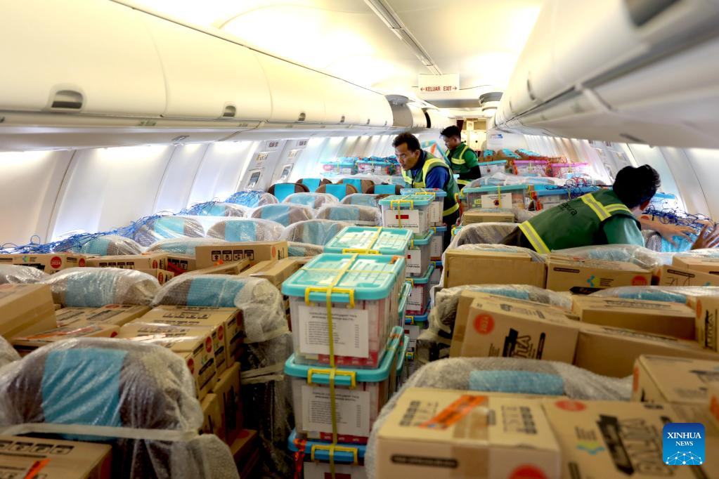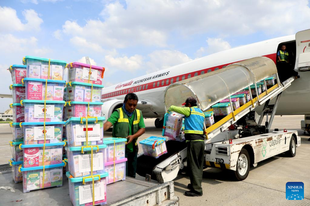 A plane carrying a medical team and 50.5 tons of logistics and food departed from Halim Perdanakusuma Air Force base in East Jakarta on Friday afternoon. (BNPB/Handout via Xinhua)