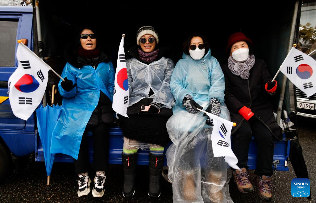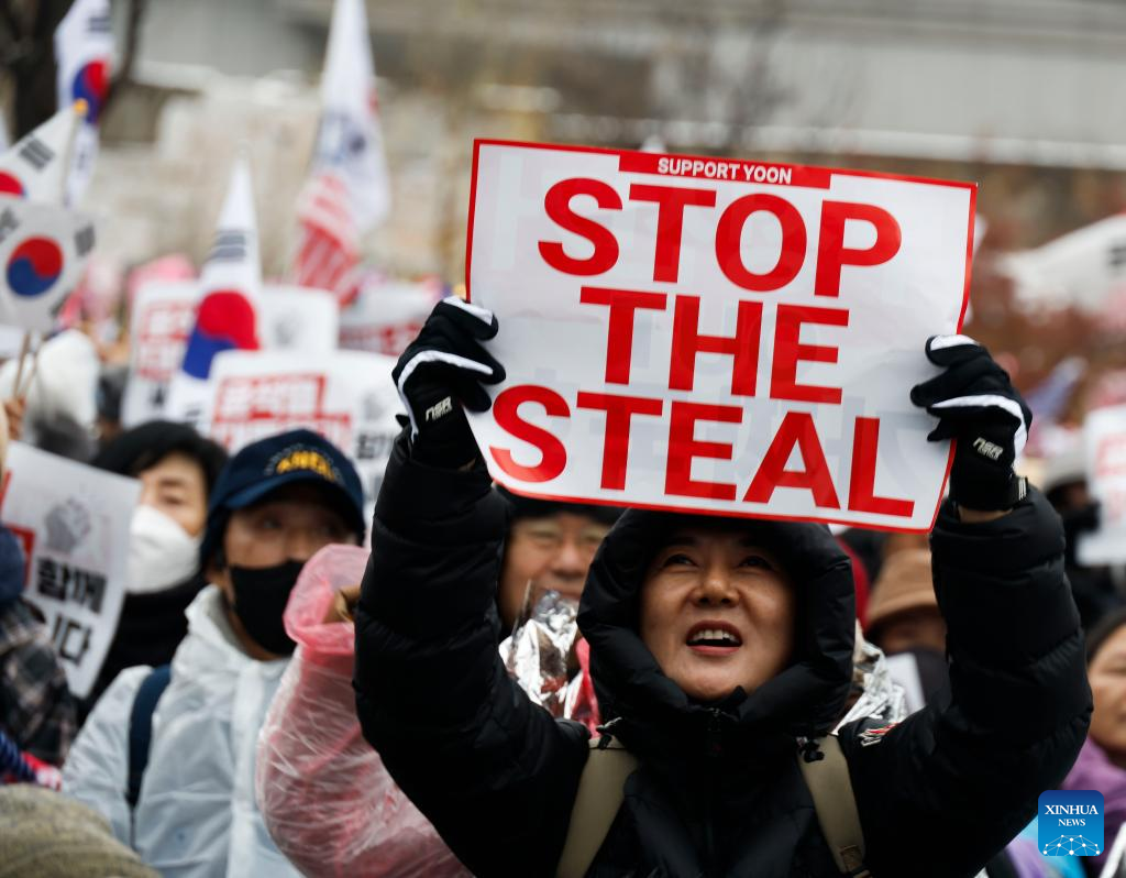 Supporters of South Korea's impeached President Yoon Suk-yeol gather in a rally near the presidential residence in Seoul, South Korea, Jan. 5, 2025. Chief of South Korea's presidential security service, Park Jong-joon, on Sunday vowed to keep blocking an attempt to arrest the impeached President Yoon Suk-yeol. If the security service, which puts its top priority on the president's absolute safety, complied with the execution of the arrest warrant against Yoon, it would have been a dereliction of duty and an abandonment of presidential security, Park said in a statement. (Photo by Jun Hyosang/Xinhua)