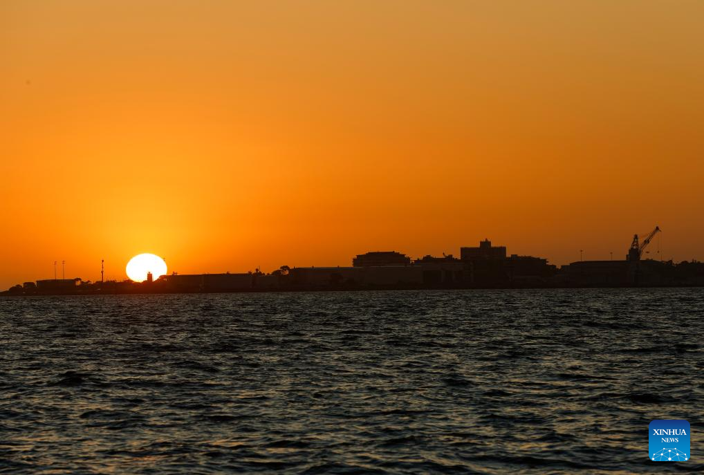 This photo taken on Jan. 10, 2025 from the Port Melbourne Beach shows the sunset scenery in Melbourne, Australia. (Xinhua/Ma Ping)