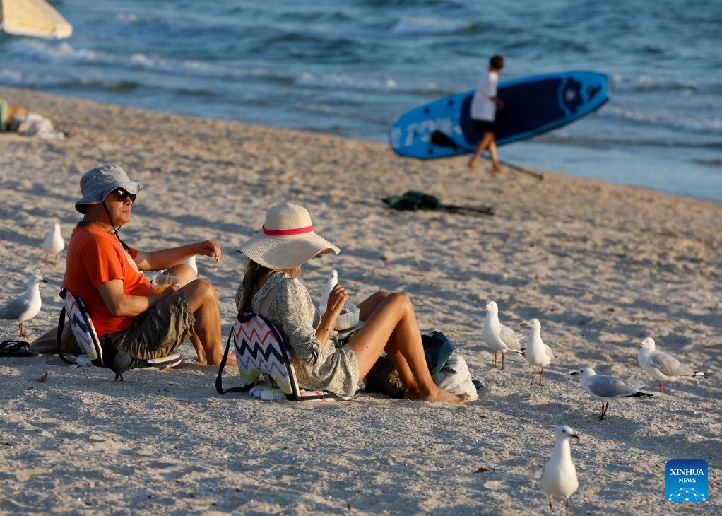 People have fun during sunset at the Port Melbourne Beach in Melbourne, Australia, Jan. 10, 2025. (Xinhua/Ma Ping)