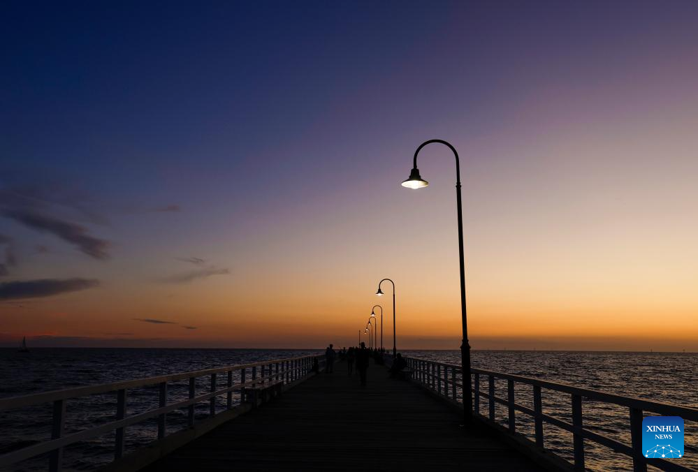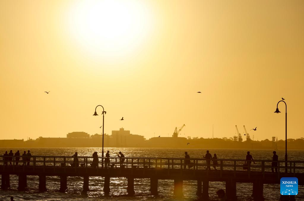 People enjoy sunset scenery on the Kerferd Road Pier at the Port Melbourne Beach in Melbourne, Australia, Jan. 10, 2025. (Xinhua/Ma Ping)
