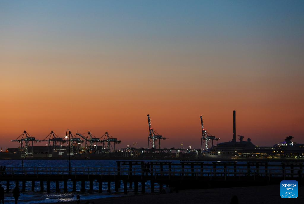 This photo taken on Jan. 10, 2025 shows the sunset scenery of Port Melbourne in Melbourne, Australia. (Xinhua/Ma Ping)