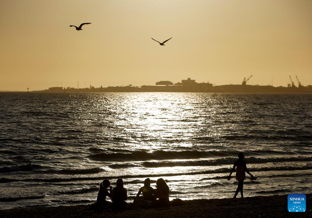 People enjoy sunset scenery at the Port Melbourne Beach in Melbourne, Australia, Jan. 10, 2025. (Xinhua/Ma Ping)