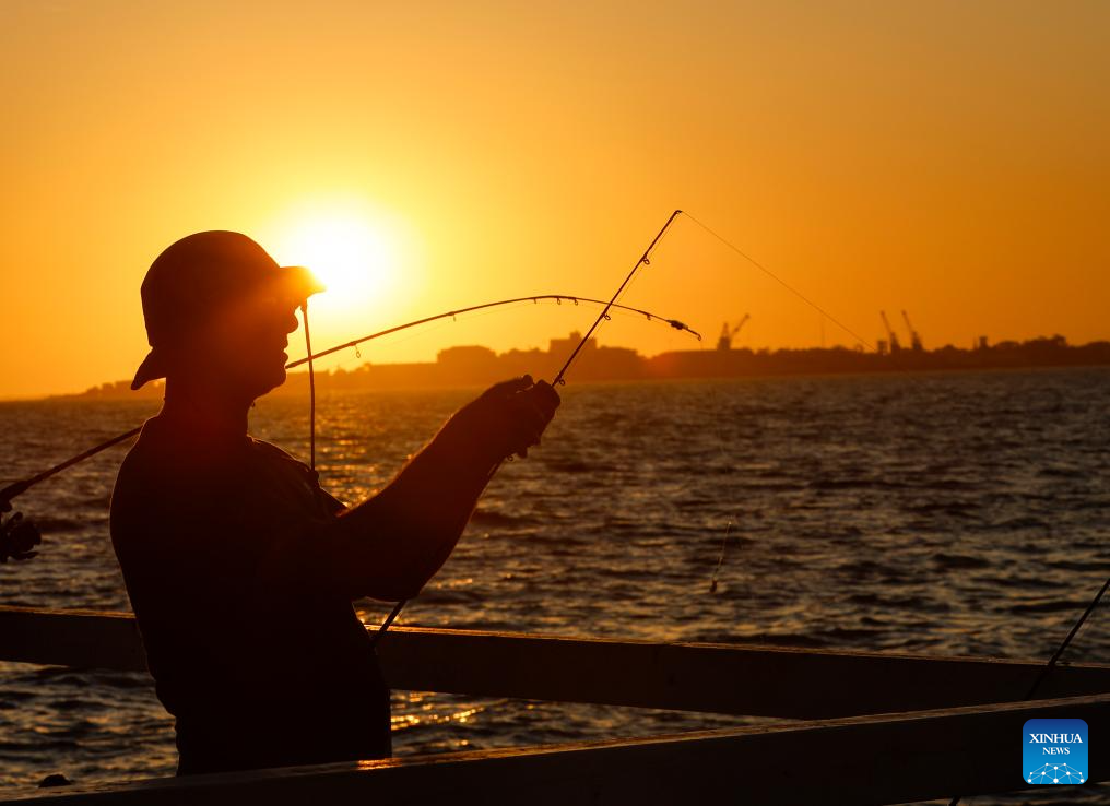 A man goes fishing during sunset on the Kerferd Road Pier at the Port Melbourne Beach in Melbourne, Australia, Jan. 10, 2025. (Xinhua/Ma Ping)