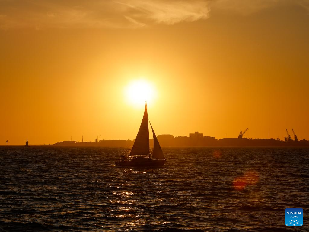 A sailing boat is seen during sunset off the Port Melbourne Beach in Melbourne, Australia, Jan. 10, 2025. (Xinhua/Ma Ping)