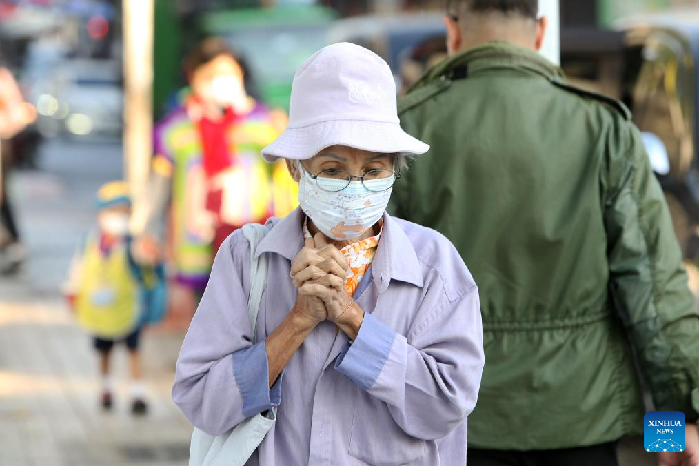 A woman wearing a long-sleeve shirt walks on street in Bangkok, Thailand, Jan. 13, 2025. The Meteorological Department announced that the lowest temperature in Bangkok reached 17 degrees Celsius on Monday. (Xinhua/Rachen Sageamsak)