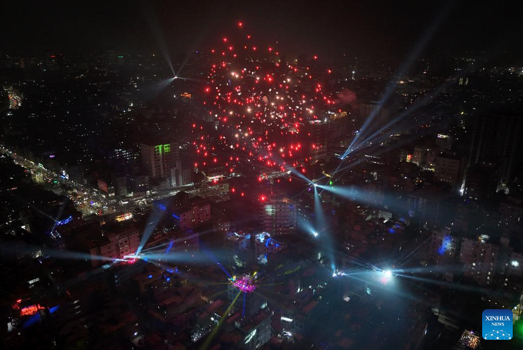 This photo taken on Jan. 14, 2025 shows coloured lights and exploding fireworks in celebration of the Sakrain festival in Dhaka, capital of Bangladesh. People in Dhaka celebrate Sakrain festival, also known as Ghuri Utsob or Kite festival, at the end of Poush, the ninth month of the Bengali calendar. (Photo by Habibur Rahman/Xinhua)