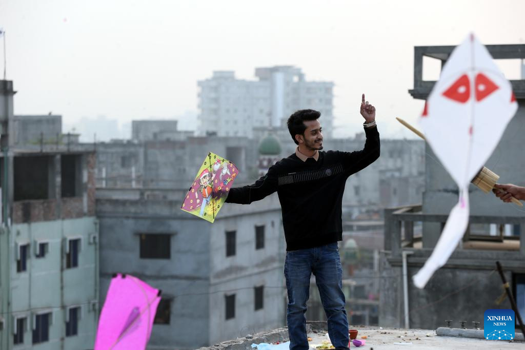 People fly kites during the Sakrain festival in Dhaka, capital of Bangladesh, Jan. 14, 2025. People in Dhaka celebrate Sakrain festival, also known as Ghuri Utsob or Kite festival, at the end of Poush, the ninth month of the Bengali calendar. (Photo by Habibur Rahman/Xinhua)