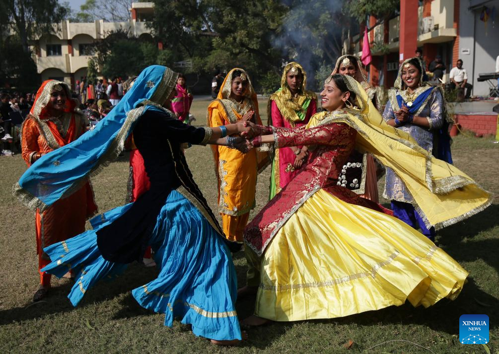 Indian college students wearing traditional Punjabi attire perform folk dance on the occasion of the Lohri festival in Amritsar district of India's northern Punjab state, Jan. 13, 2025. The Lohri festival event is celebrated annually on Jan. 13 by flying kites and lighting bonfires. (Str/Xinhua)