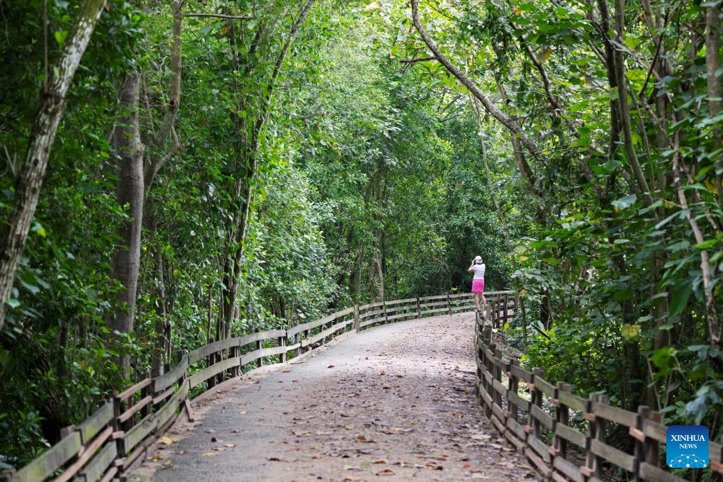 A tourist visits Singapore's Sungei Buloh Wetland Reserve on Jan. 15, 2025. Located in the northwest of Singapore, Sungei Buloh Wetland Reserve covers an area of more than 200 hectares of mangroves, ponds and forests. In 2003, the reserve was recognized as Singapore's first ASEAN Heritage Park. (Photo by Then Chih Wey/Xinhua)