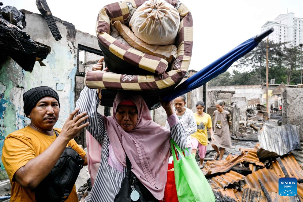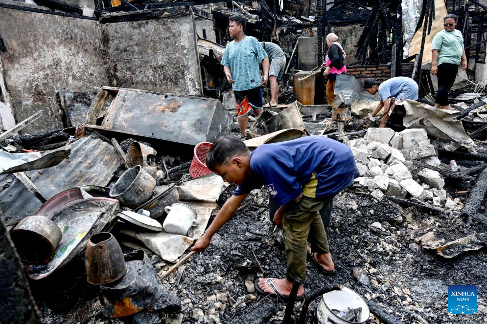 People collect usable items near damaged houses after a fire in Kemayoran sub-district of Central Jakarta, Indonesia, Jan. 21, 2025. More than 600 families in the Indonesian city of Jakarta were forced to evacuate after a blaze destroyed over 500 houses in Kemayoran sub-district of Central Jakarta early Tuesday, city officials said. (Xinhua/Agung Kuncahya B.)