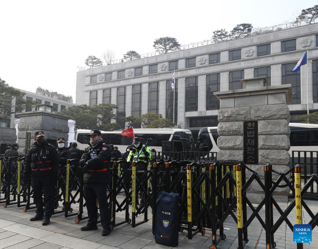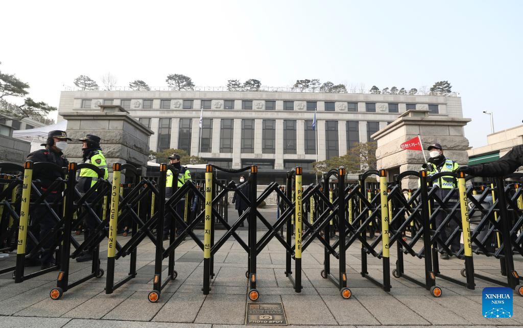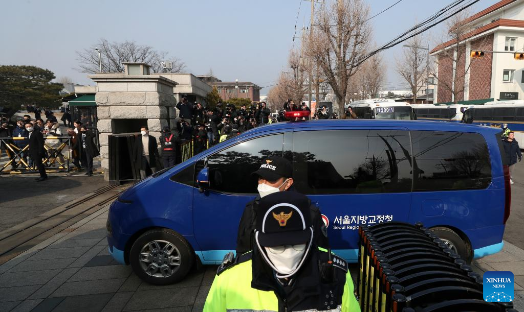 The convoy, escorted by police and presidential security service, filed into the court after leaving the Seoul Detention Center in Uiwang, around 30 km south of the court, about 20 minutes earlier. (Xinhua/Yao Qilin)