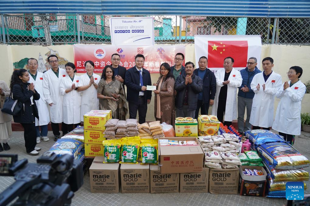The Chinese Enterprises Association in Nepal makes a donation to Prayas Nepal, a non-profit and non-governmental organization, after a Chinese medical team provided free health check-ups to Nepali orphans in Kathmandu, Nepal, Jan. 22, 2025. Doctors from a Chinese medical team in Nepal provided free health check-ups for some orphans in Kathmandu, the country's capital, on Wednesday. (Photo by Hari Maharjan/Xinhua)