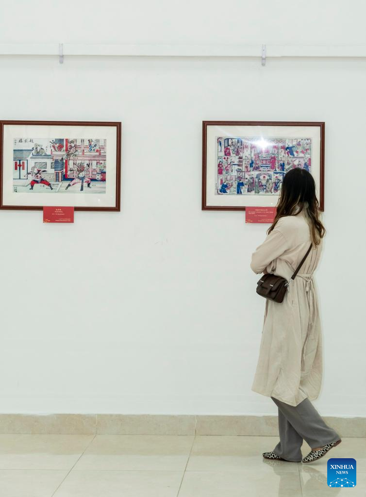 A visitor looks at Chinese New Year paintings at an exhibition in Kathmandu, Nepal, Jan. 24, 2025. An exhibition of 60 woodblock Chinese New Year paintings was inaugurated here on Friday, offering a glimpse into the celebration of the Spring Festival in China. (Photo by Hari Maharjan/Xinhua)