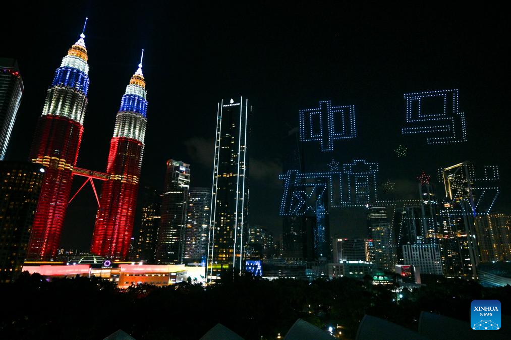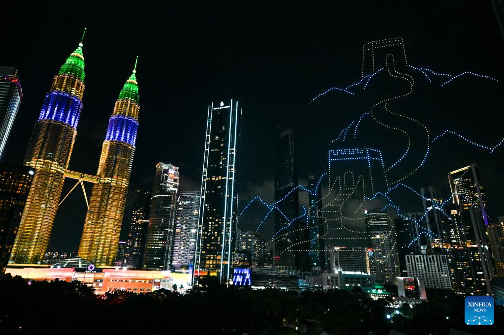 A drone light show is staged before the 2025 "Happy Chinese New Year" global launching ceremony in Kuala Lumpur, Malaysia, Jan. 25, 2025.
