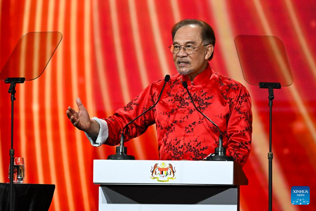 Malaysian Prime Minister Anwar Ibrahim speaks at the 2025 "Happy Chinese New Year" global launching ceremony and gala in Kuala Lumpur, Malaysia, Jan. 25, 2025.
