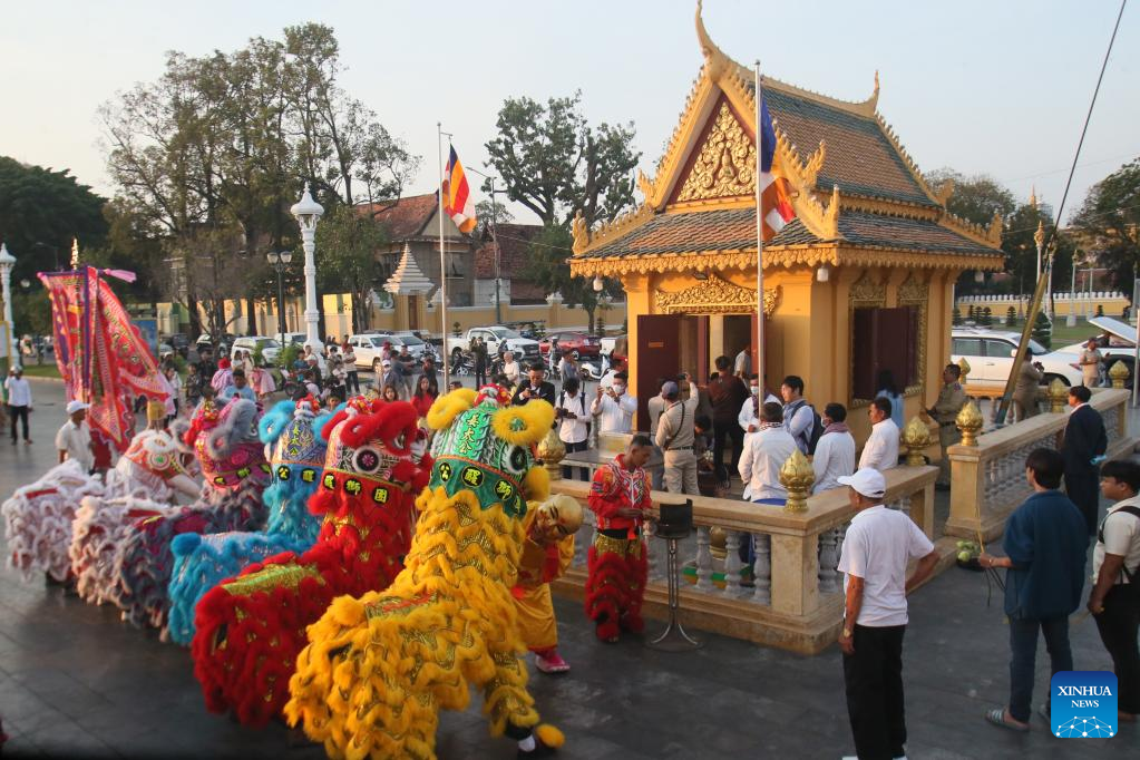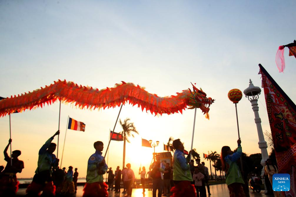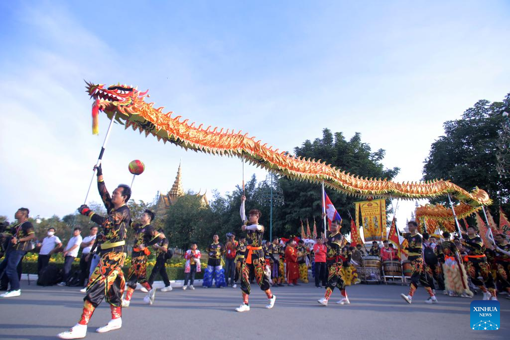 PHNOM PENH, Jan. 28 (Xinhua) -- Folk artists performed lion and dragon dances in Cambodia on Tuesday to celebrate the Chinese New Year, or the Spring Festival, which will fall on Wednesday.