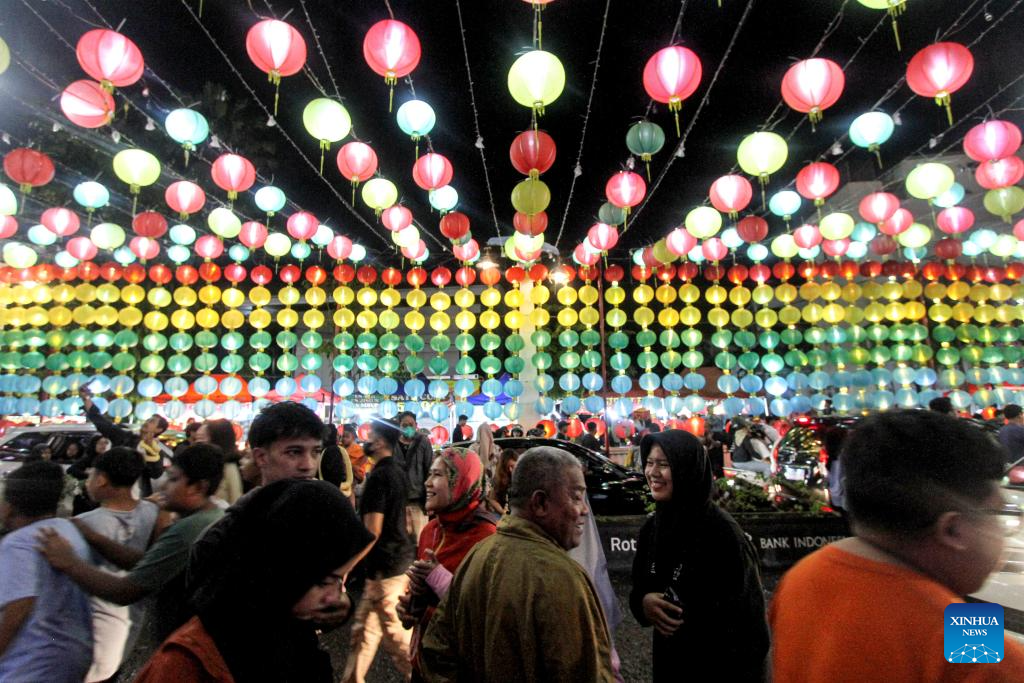 This photo taken on Jan. 27, 2025 shows people passing by lantern decorations installed for the Chinese New Year in Surakarta, Central Java, Indonesia. (Photo by Bram Selo/Xinhua)