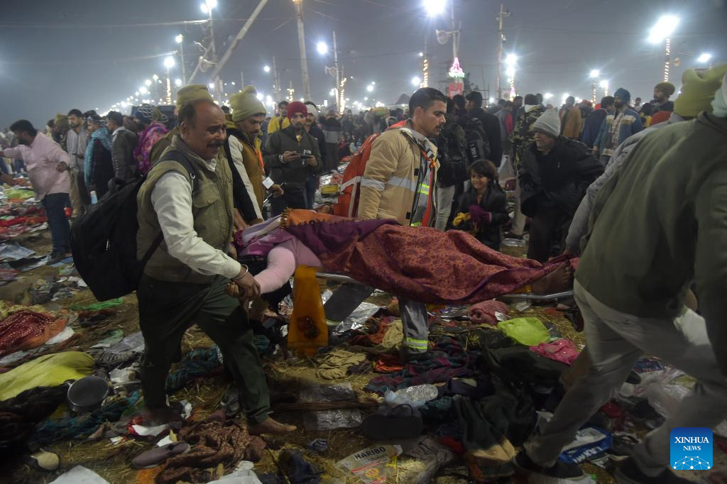 Rescuers carry a victim on a stretcher after a stampede in Prayagraj of India's northern state of Uttar Pradesh on Jan. 29, 2025. Several people were feared dead and scores others were injured in a stampede Wednesday morning at India's mega Hindu festival, Maha Kumbh Mela, in the northern state of Uttar Pradesh, officials said. The stampede occurred after a barrier broke as tens of thousands of devotees thronged the Triveni Sangam on the occasion of taking a holy dip. (Str/Xinhua)