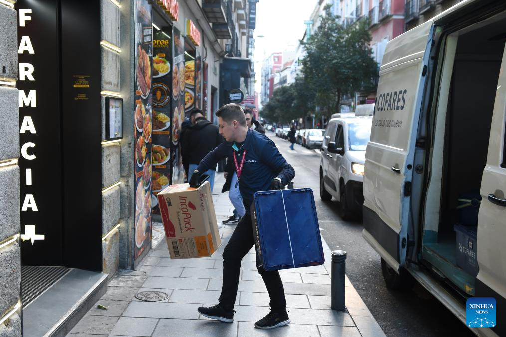 A delivery man carries packages on a street in Madrid, Spain, Jan. 28, 2025. Spain concluded 2024 with record employment figures, according to the Economically Active Population Survey (EPA) published by the country's Statistical Office on Tuesday. The unemployment rate dropped to 10.6 percent, the lowest since the second quarter of 2008 when it was 10.36 percent. (Photo by Gustavo Valiente/Xinhua)