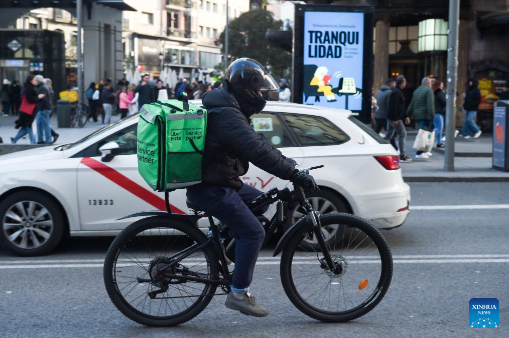 A delivery man rides on a street in Madrid, Spain, Jan. 28, 2025. Spain concluded 2024 with record employment figures, according to the Economically Active Population Survey (EPA) published by the country's Statistical Office on Tuesday. The unemployment rate dropped to 10.6 percent, the lowest since the second quarter of 2008 when it was 10.36 percent. (Photo by Gustavo Valiente/Xinhua)
