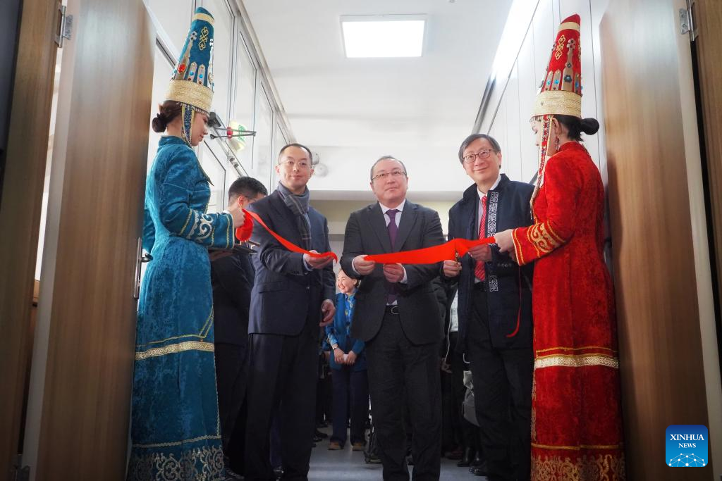 Guests cut a red ribbon at the launch ceremony of an academy of education in Almaty, Kazakhstan, Feb. 3, 2025.(Xinhua/Zhao Yu)