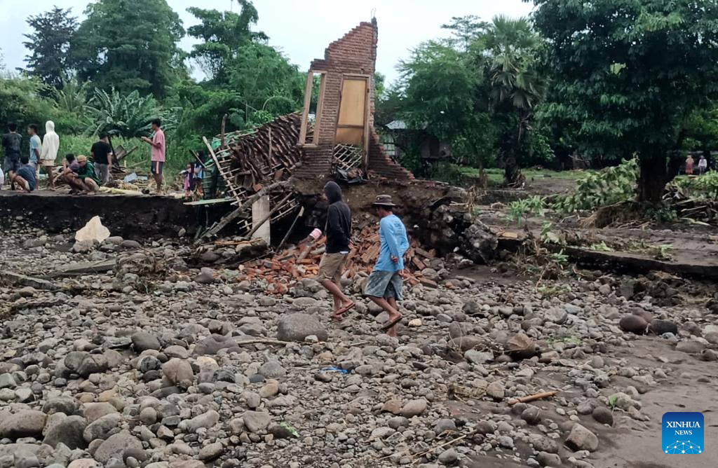 The natural disaster struck Wera sub-district of Bima regency, sweeping away seven houses, collapsing one bridge, and cutting off electricity, said Saidar Rahmanjaya, head of the operational unit of the provincial search and rescue office. (Photo by BNPB/Handout via Xinhua)