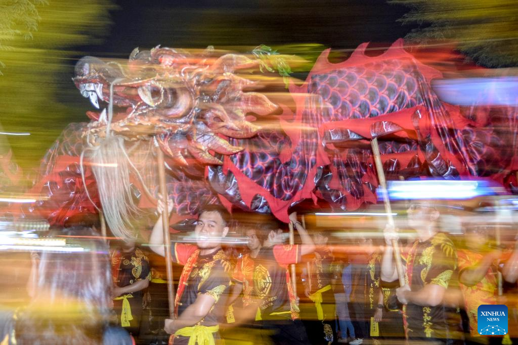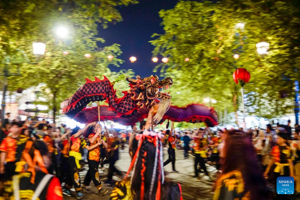 People perform dragon dance during a Chinese New Year Carnival at Malioboro Street in Yogyakarta, Indonesia, on Feb. 6, 2025. (Photo by Agung Supriyanto/Xinhua)