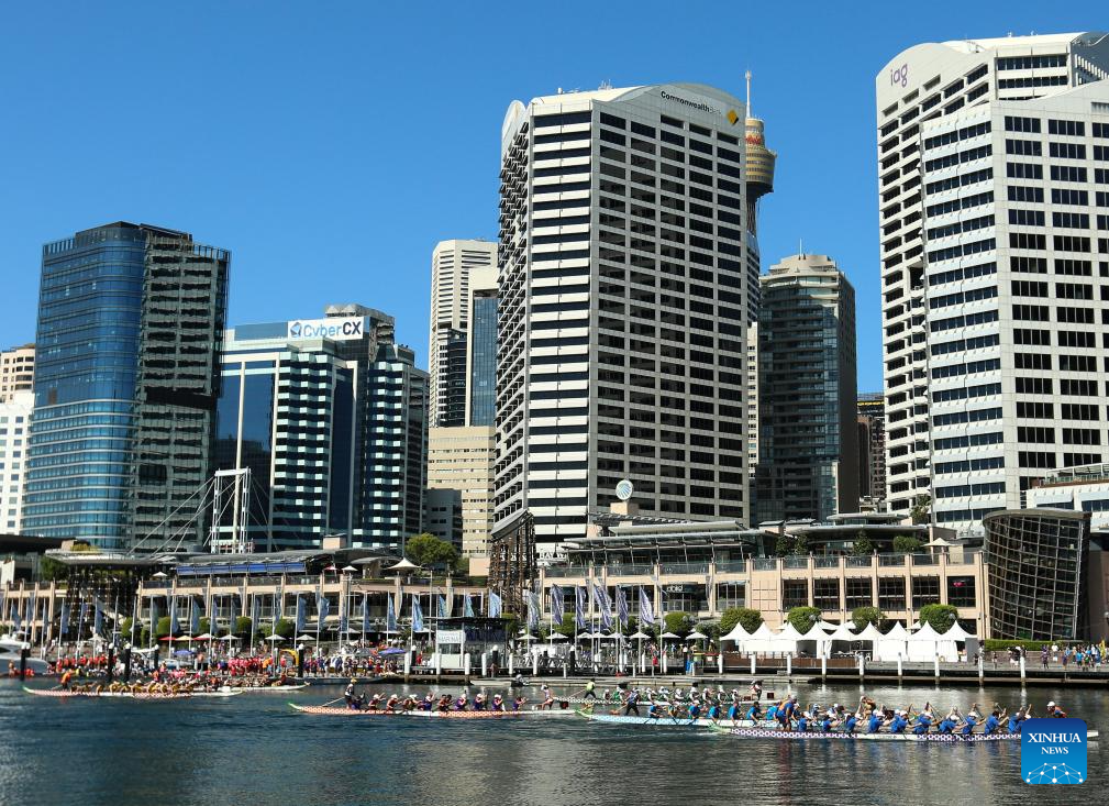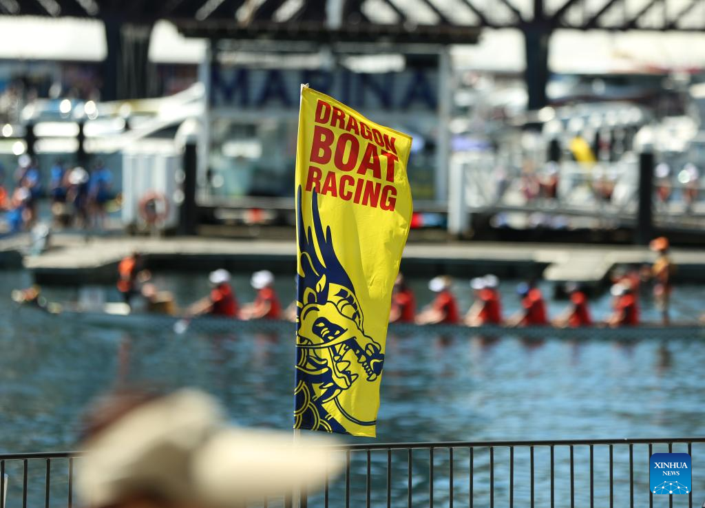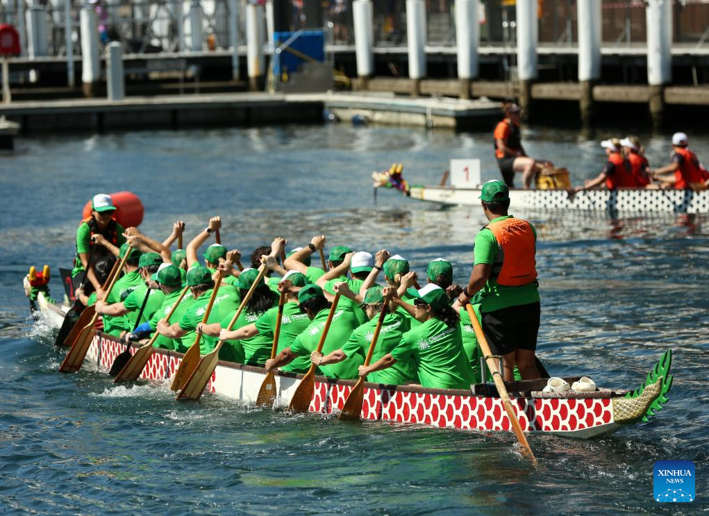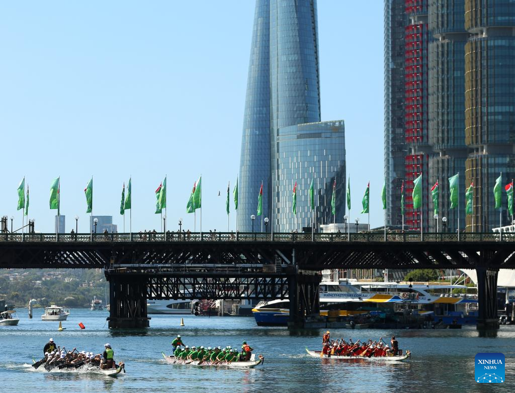Contestants take part in a dragon boat race at Darling Harbour in Sydney, Australia, Feb. 7, 2025. As part of the celebrations to mark the Chinese Lunar New Year, the dragon boat races kicked off here on Friday and will last till Feb. 9. (Xinhua/Ma Ping)