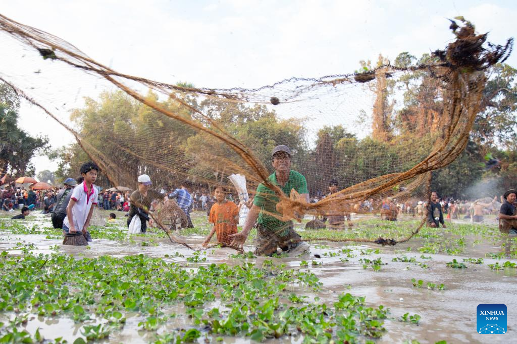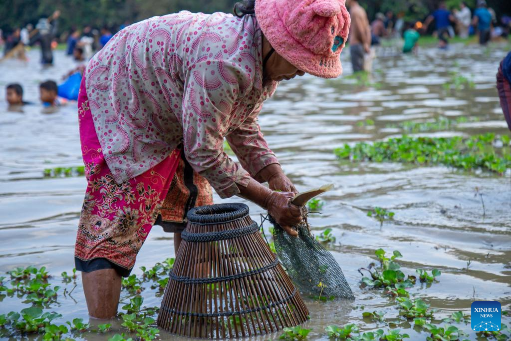 A woman puts fish into a net during a traditional fish-catching ceremony in a lake in Siem Reap province, Cambodia on Feb. 9, 2025. (Photo by Sao Khuth/Xinhua)