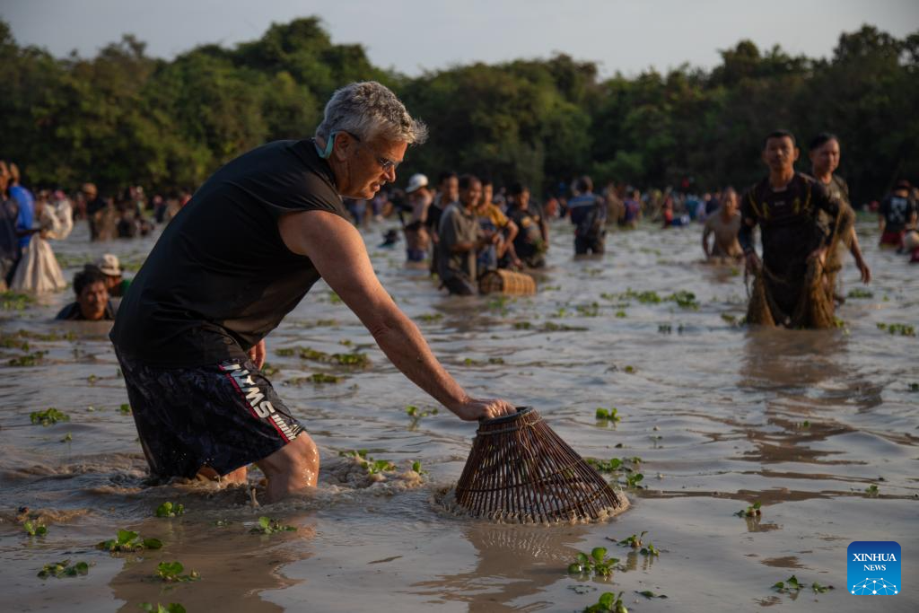 A foreign tourist tries to catch fish with a traditional woven bamboo trap during a traditional fish-catching ceremony in a lake in Siem Reap province, Cambodia on Feb. 9, 2025. (Photo by Sao Khuth/Xinhua)