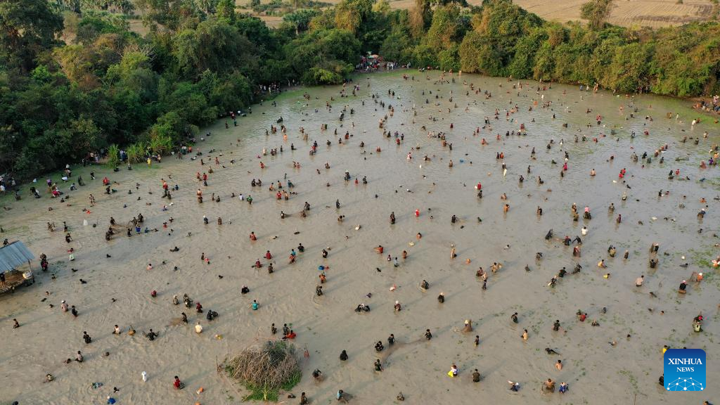 An aerial drone photo taken on Feb. 9, 2025 shows people taking part in a traditional fish-catching ceremony in a lake in Siem Reap province, Cambodia. (Photo by Sao Khuth/Xinhua)