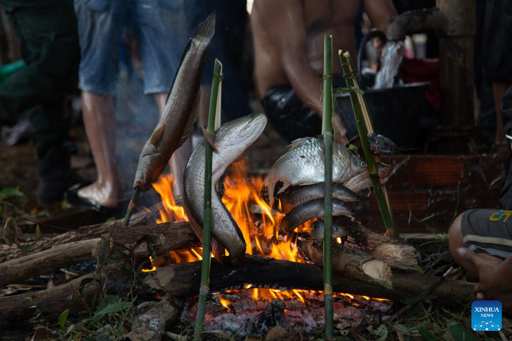 People grill fish over fire during a traditional fish-catching ceremony in a lake in Siem Reap province, Cambodia on Feb. 9, 2025. (Photo by Sao Khuth/Xinhua)