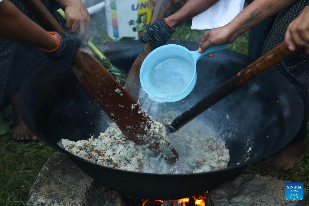 People prepare Htamane, a cherished traditional glutinous rice dish of Myanmar, at the Shwedagon Pagoda in Yangon, Myanmar, Feb. 11, 2025. (Photo by Myo Kyaw Soe/Xinhua)