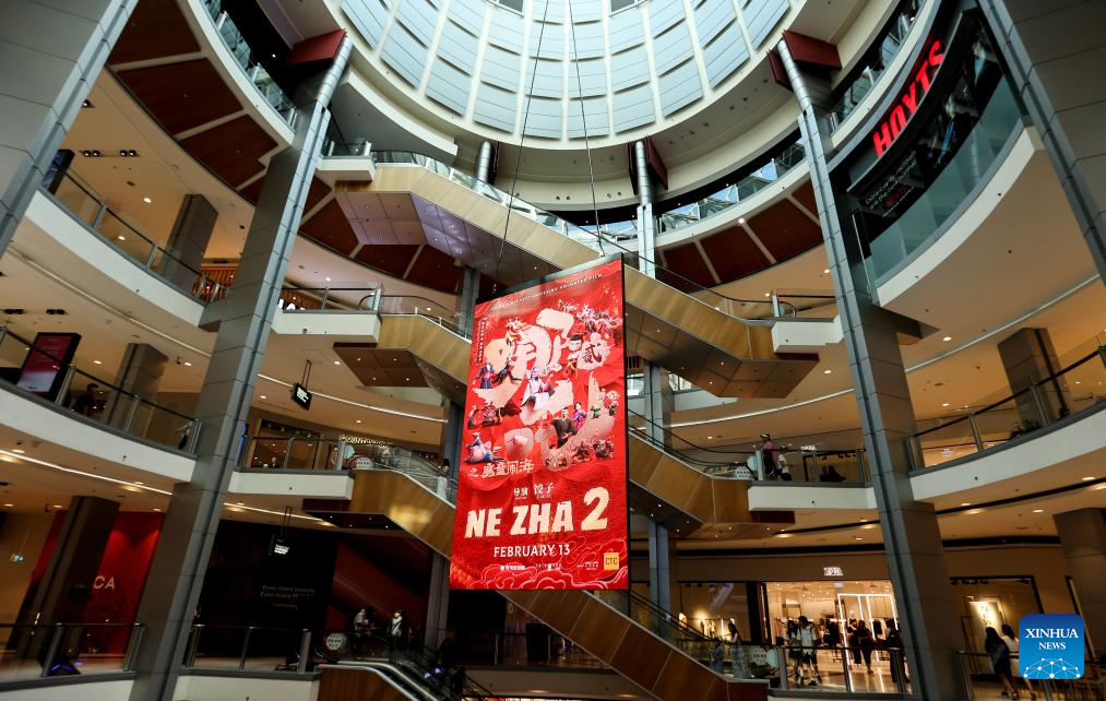 This photo taken on Feb. 13, 2025 shows a projected poster for the Chinese fantasy feature "Ne Zha 2" at a shopping mall in Sydney, Australia. Chinese animated film "Ne Zha 2" was well received in its premiere in Sydney, Australia, on Tuesday night, as the box office hit drew more than 300 cultural figures, film and television industry professionals, social media influencers and movie fans. (Xinhua/Ma Ping)