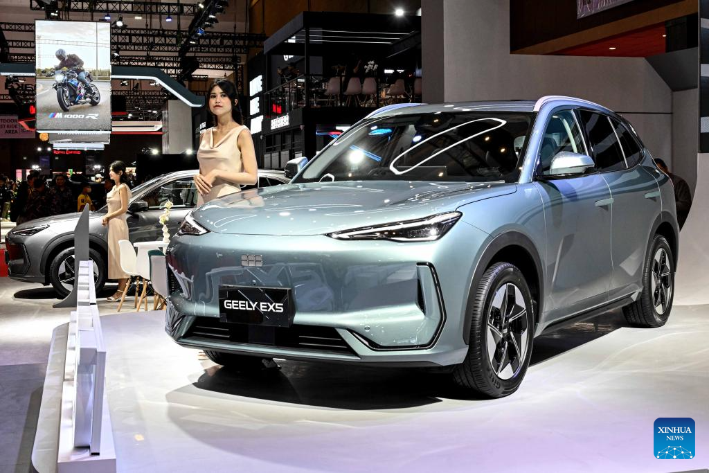 This photo taken on Feb. 13, 2025 shows a model of Geely EX5 in the booth of Geely, a Chinese auto brand, during the 2025 Indonesia International Motor Show (IIMS) in Jakarta, Indonesia. The 2025 IIMS opened in Jakarta on Thursday, with many Chinese auto brands on display. (Xinhua/Agung Kuncahya B.)