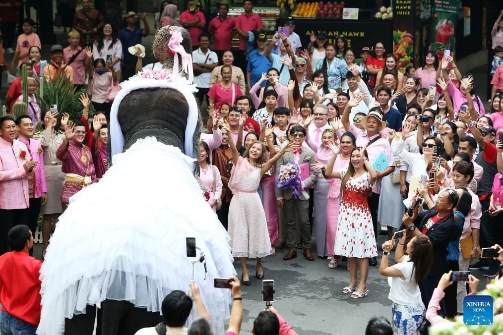 People celebrate during a mass wedding ceremony at Nong Nooch Tropical Garden in Pattaya, Thailand, Feb. 14, 2025. Nine couples tied the knot while riding elephants here on Friday in a Valentine's Day mass wedding ceremony. (Xinhua/Rachen Sageamsak)