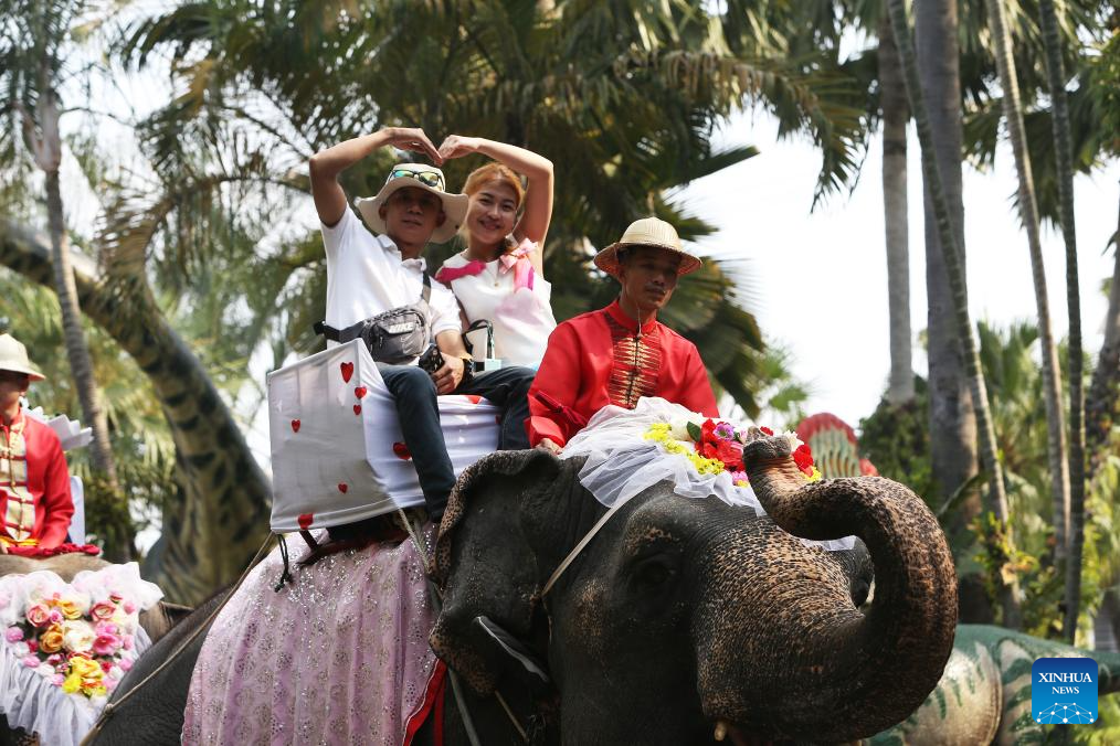 A couple rides elephant during a mass wedding ceremony at Nong Nooch Tropical Garden in Pattaya, Thailand, Feb. 14, 2025. Nine couples tied the knot while riding elephants here on Friday in a Valentine's Day mass wedding ceremony. (Xinhua/Rachen Sageamsak)