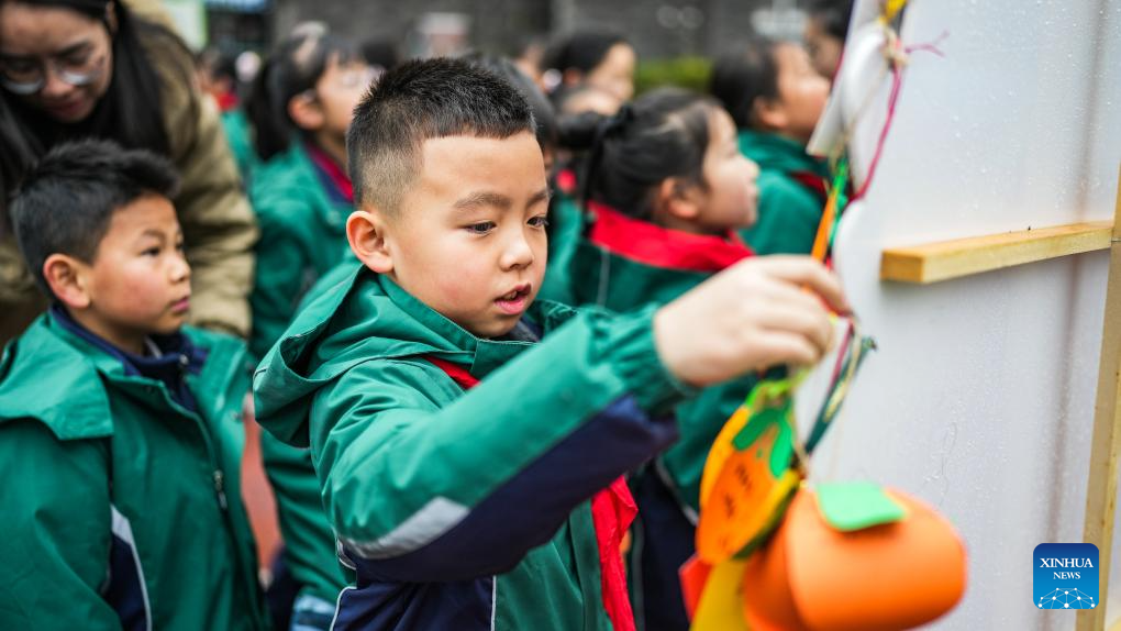 A student hangs a wish card at a primary school in Guiyang City, southwest China's Guizhou Province, Feb. 17, 2025. The new semester for primary and secondary schools kicked off in many parts of China on Monday. (Xinhua/Tao Liang)