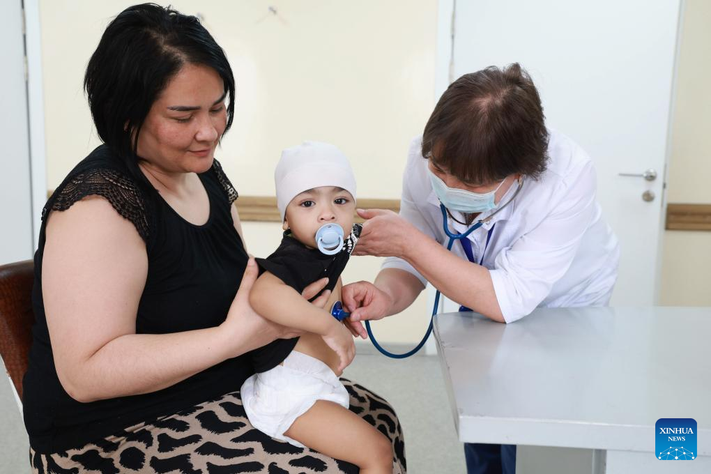 A doctor checks a child patient at a hospital in Bishkek, Kyrgyzstan, Feb. 24, 2025. The incidence of acute respiratory viral infections (ARVI) and influenza has been rising in Kyrgyzstan, the press service of the country's Ministry of Health said recently. (Photo by Roman Gainanov/Xinhua)