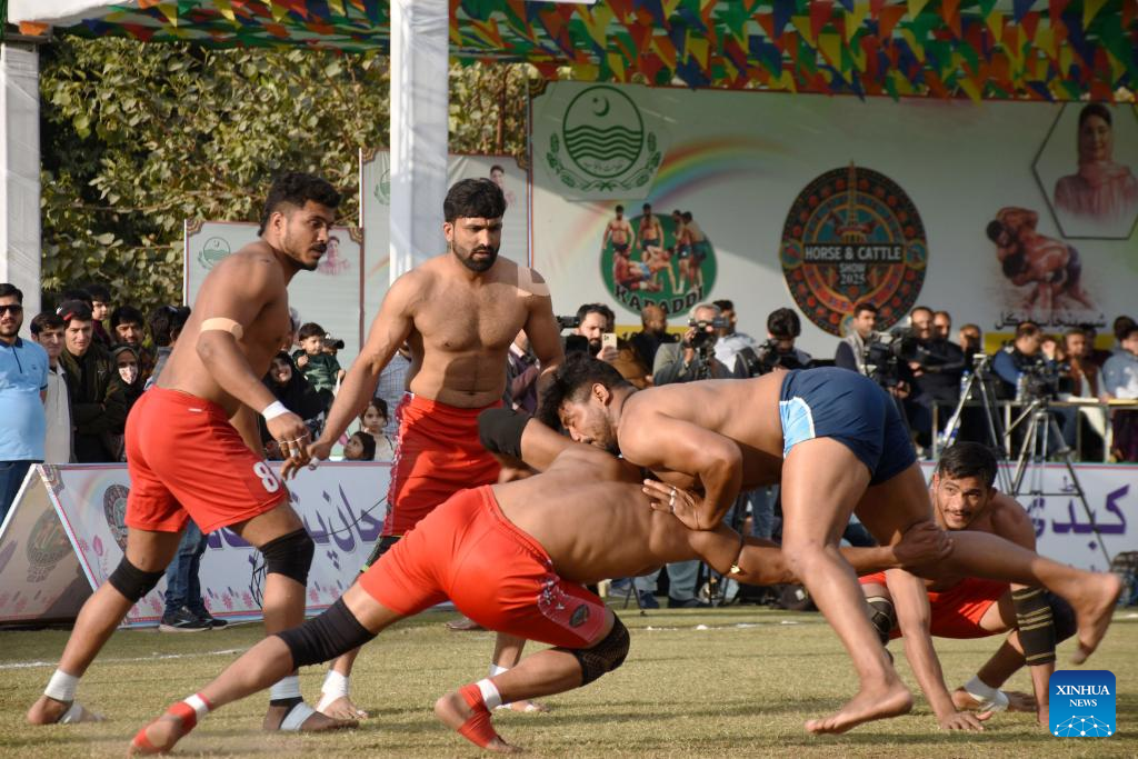 People compete in a Kushti match in Lahore, Pakistan, Feb. 18, 2025. Pehlwani wrestling, also known as Kushti, is a traditional competitive sport which was developed in the Mughal era. It is popular in South Asian countries. (Photo by Sajjad/Xinhua)