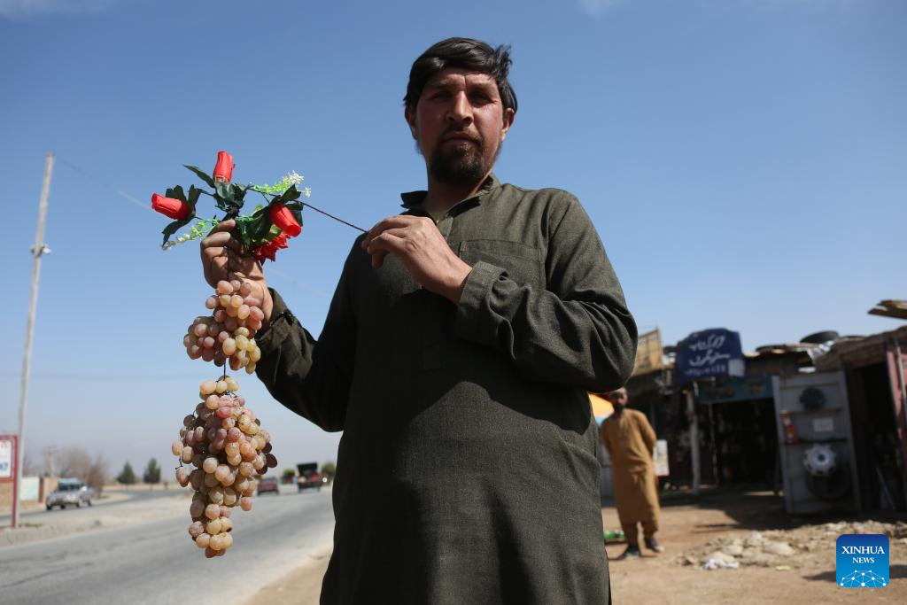 An Afghan street vendor shows grapes on Kangana in the Kalakan district of Kabul, the capital of Afghanistan, Feb. 23, 2025. (Photo by Saifurahman Safi/Xinhua)