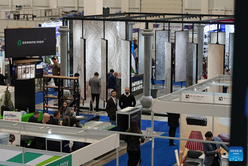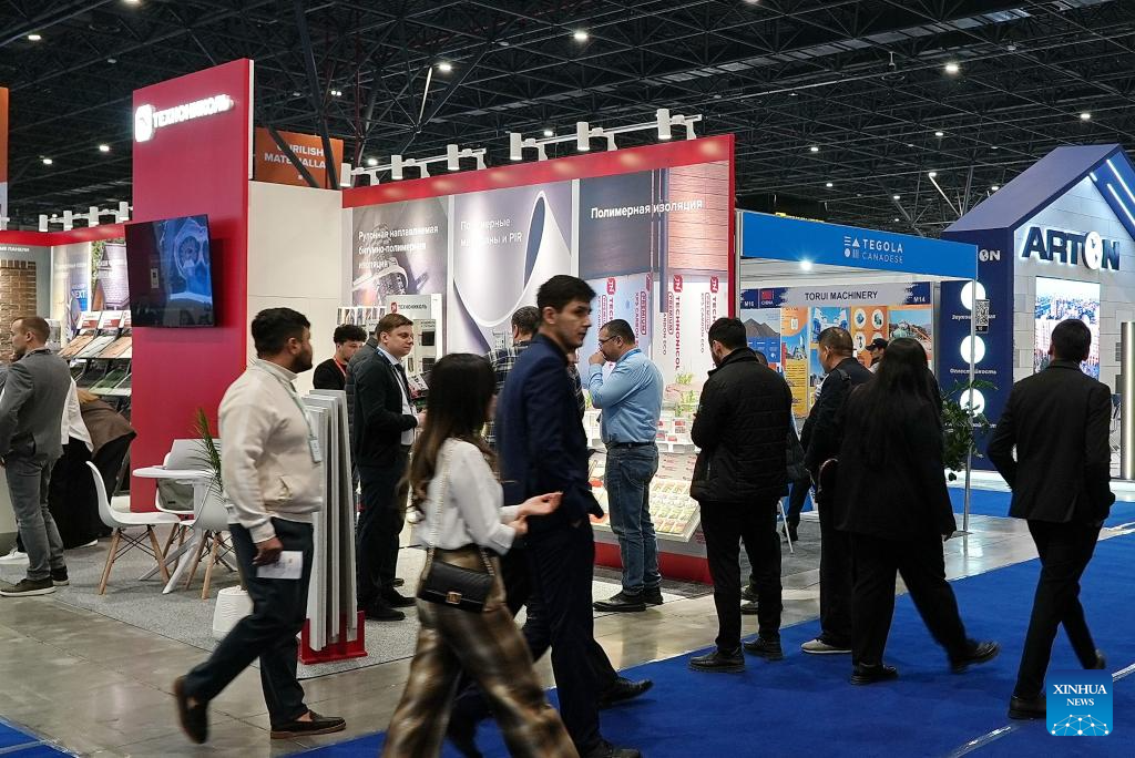 People attend UzBuild, an international exhibition for construction and interior design, in Tashkent, the capital of Uzbekistan, Feb. 25, 2025. The three-day exhibition, which kicked off here on Tuesday, covers a wide range of topics including construction technologies, building materials, interior decoration, and design. (Photo by Zafar Khalilov/Xinhua)