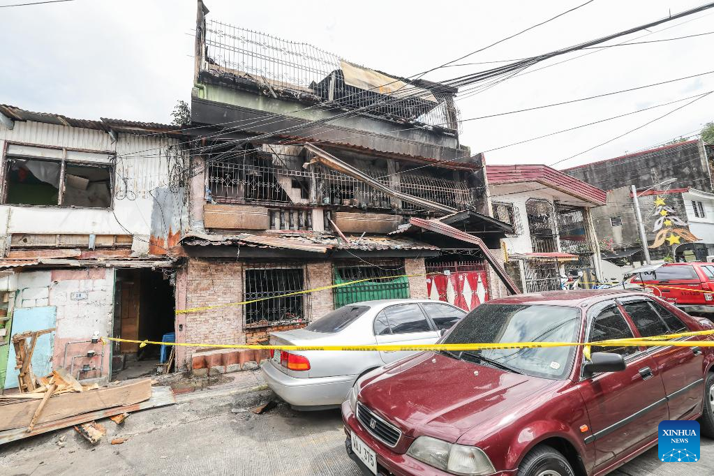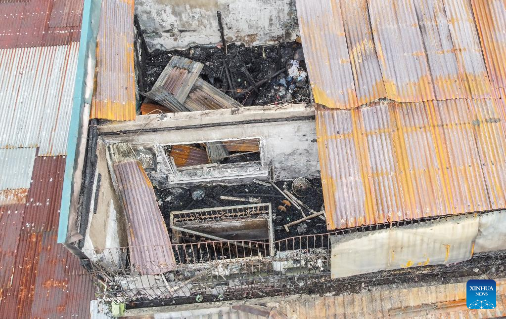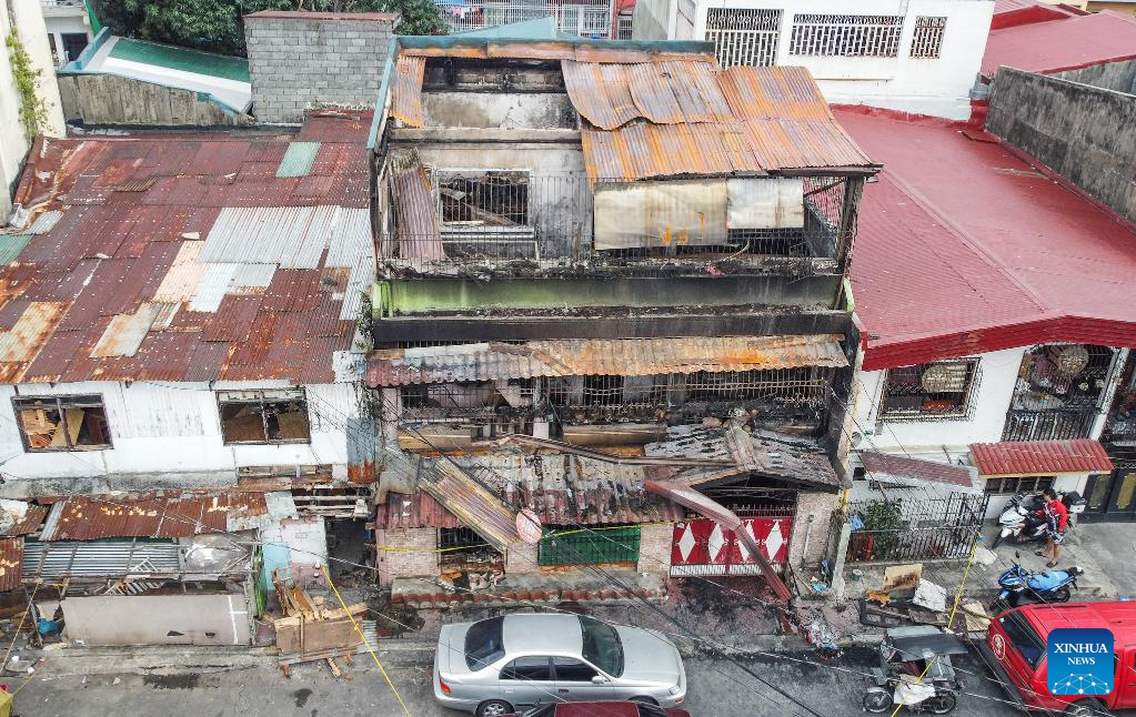 An aerial photo shows the site of a fire accident in Quezon City, the Philippines, Feb. 27, 2025. Eight people were killed after a fire razed a three-storey residential building in the Philippine capital on Thursday, the Bureau of Fire Protection said. The bureau said the fire broke out early Thursday morning in Quezon City suburb while the occupants were fast asleep. (Xinhua/Rouelle Umali)
