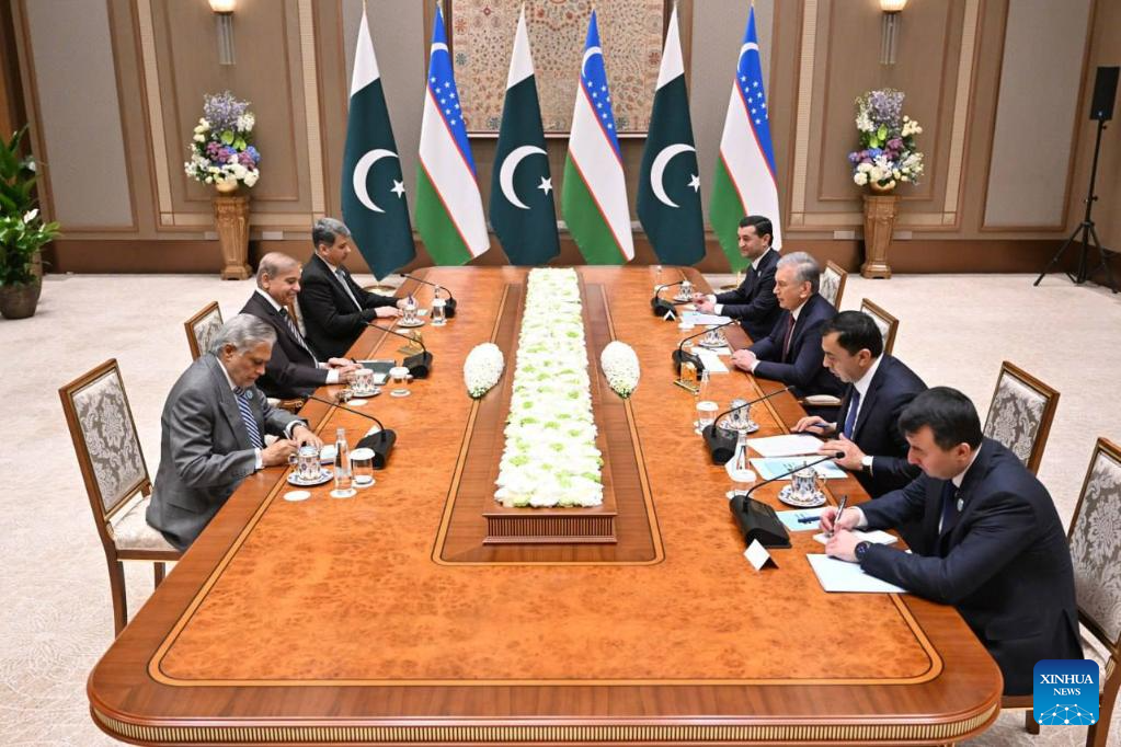 TASHKENT, Feb. 26 (Xinhua) -- Uzbek President Shavkat Mirziyoyev and Pakistani Prime Minister Shehbaz Sharif held a meeting in Tashkent, the press service of the president of Uzbekistan reported Wednesday.