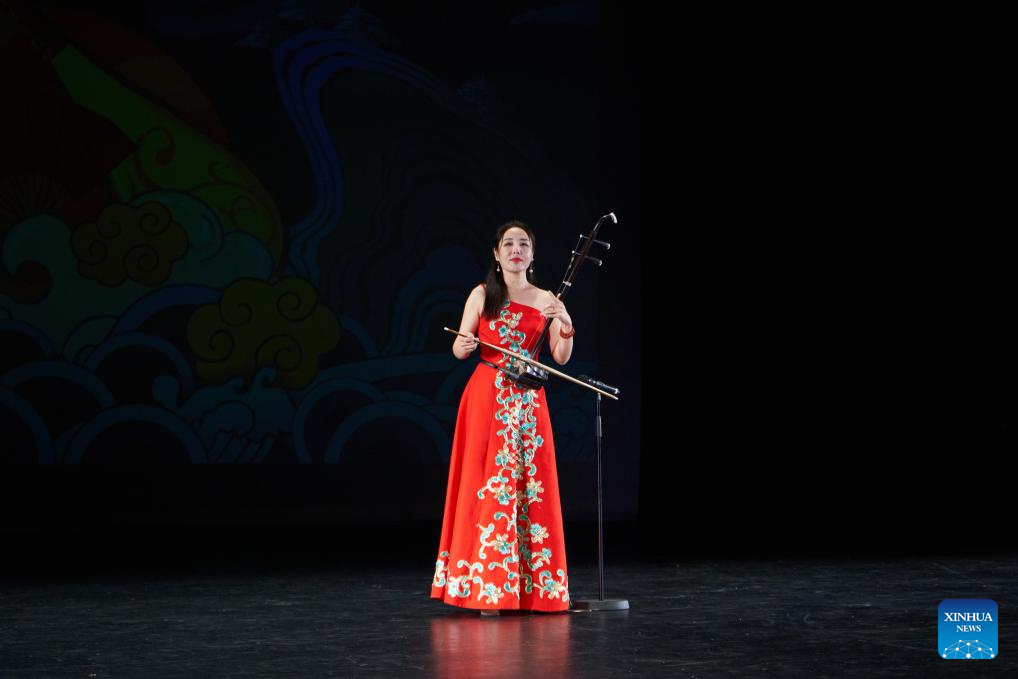 A musician performs during a cultural tourism promotion event of China's Hebei Province in Christchurch, New Zealand, March 3, 2025. China's Hebei Province promoted cultural tourism in New Zealand's South Island on Monday, showing local audience acrobatics, Hebei bangzi, a genre of Chinese opera, and other folk culture performances.