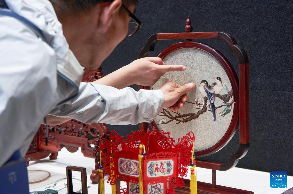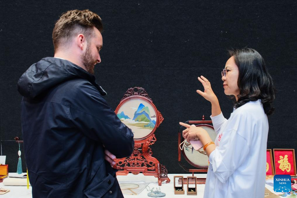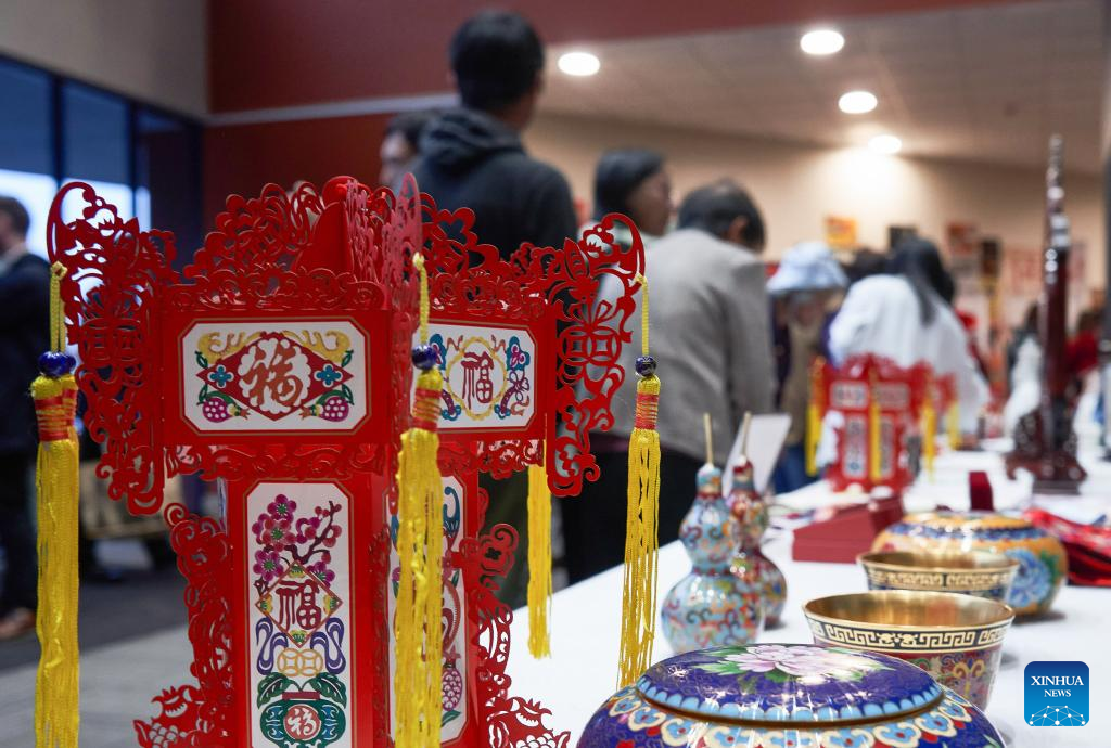 People visit the "Yanzhao Craftsmanship" intangible cultural heritage exhibition during a cultural tourism promotion event of China's Hebei Province in Christchurch, New Zealand, March 3, 2025. China's Hebei Province promoted cultural tourism in New Zealand's South Island on Monday, showing local audience acrobatics, Hebei bangzi, a genre of Chinese opera, and other folk culture performances.Traditional Chinese instruments such as Suona and Erhu performances were also displayed to the local people, organized by the delegation of the Hebei Provincial Department of Culture and Tourism.The "Encounter Hebei" photo exhibition and the "Yanzhao Craftsmanship" intangible cultural heritage exhibition were also held as part of the promotion activities. "Yanzhao" is a traditional Chinese alias of the lands where Hebei is now lying. (Photo by Chen Siyumeng/Xinhua)